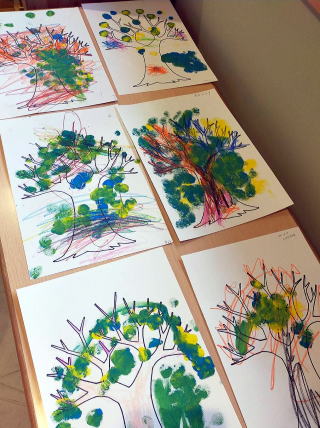 青と黄色の絵具を ポンポンでスタンプしたら 元気な緑の葉っぱが 描けました。 |